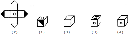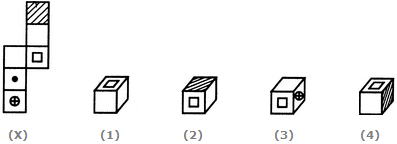 The fig. (X) is similar to Form V. So, when the sheet shown in fig. (X) is folded to form a cube, then the face with shading lies opposite to the free bearing a square, the face bearing a dot lies opposite to a blank face and the face bearing a circle (with a '+' sign inside it) lies opposite to another blank face. The cubes in figures (2) and (4) have the shaded face adjacent to the face bearing a square. Therefore, the cubes in these two figures cannot be formed. Hence, only cubes in figures (1) and (3) can be formed.